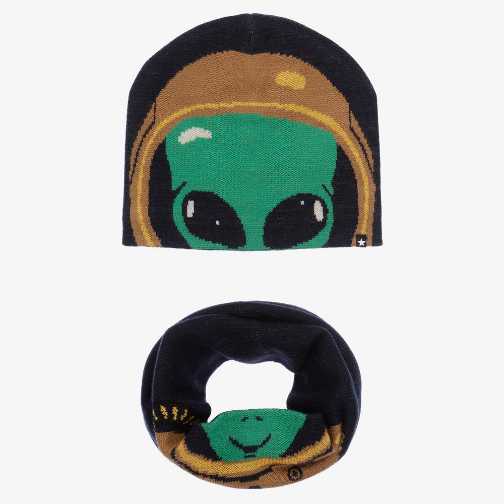 Boys dark navy blue beanie hat and snood set from Danish label Molo, knitted in a cosy wool blend. Creating a playful look, this accessory set has a quirky alien design in green and beige. Both pieces have a soft polar fleece lining for extra warmth and a black and white star logo tab stitched on the side.
