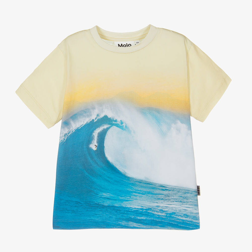 A yellow and blue T-shirt for boys by Molo, made in soft organic cotton jersey. With a ribbed crew neck, this casual piece has a surf-themed graphic print on the front and back. A small black and white logo tab can be seen on the side seam.