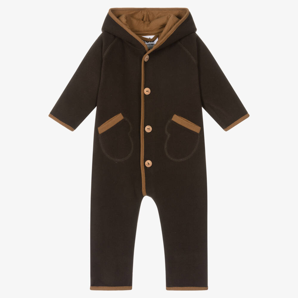 Deep brown hooded pramsuit for baby boys and girls from Danish brand Molo, made in super-soft polar fleece. Eco-conscious, this pramsuit is made with recycled polyester from plastic bottles. The sleeves and cuffs can be folded over for extra cosiness and protection from cold chills. It has piped trims, wooden button fastenings and cute mitten-shaped front pockets.