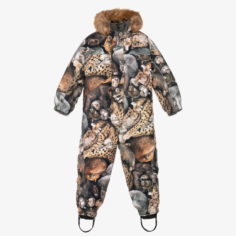 Boys and girls technical snowsuit by Molo, with an adorable brown sleeping cubs print on a black background. Soft, smooth and durable, the shell, lining and padding are made with recycled polyester. With medium-weight 3M™ Thinsulate™ insulation, this breathable snowsuit has an eco-friendly, waterproof coating and taped seams to keep your little one warm and dry. It features handy front pockets, removable rubber stirrups and internal braces. It has a removable hood with a detachable faux fur trim, soft polar fleece lining, and light reflective details for added safety. There is a gold popper flap over the front zip fastening for protection from the elements.
