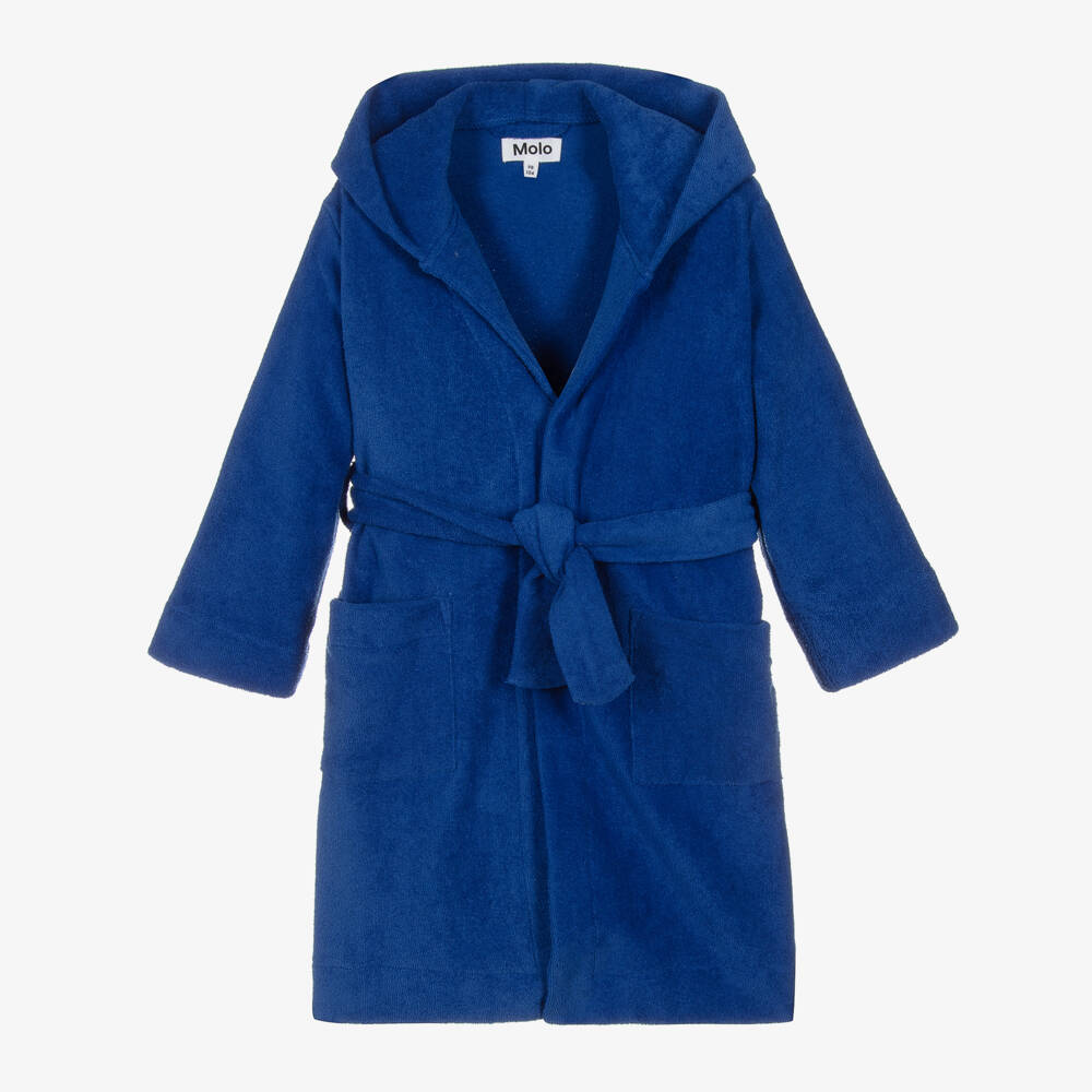 A cobalt blue bathrobe for boys by Danish brand Molo, made in soft terry towelling. Ideal for after a bath or swim, this cosy robe features two generous front pockets and a hood to keep the head warm. It is made in absorbent organic cotton and ties comfortably around the waist with a detachable sash belt.