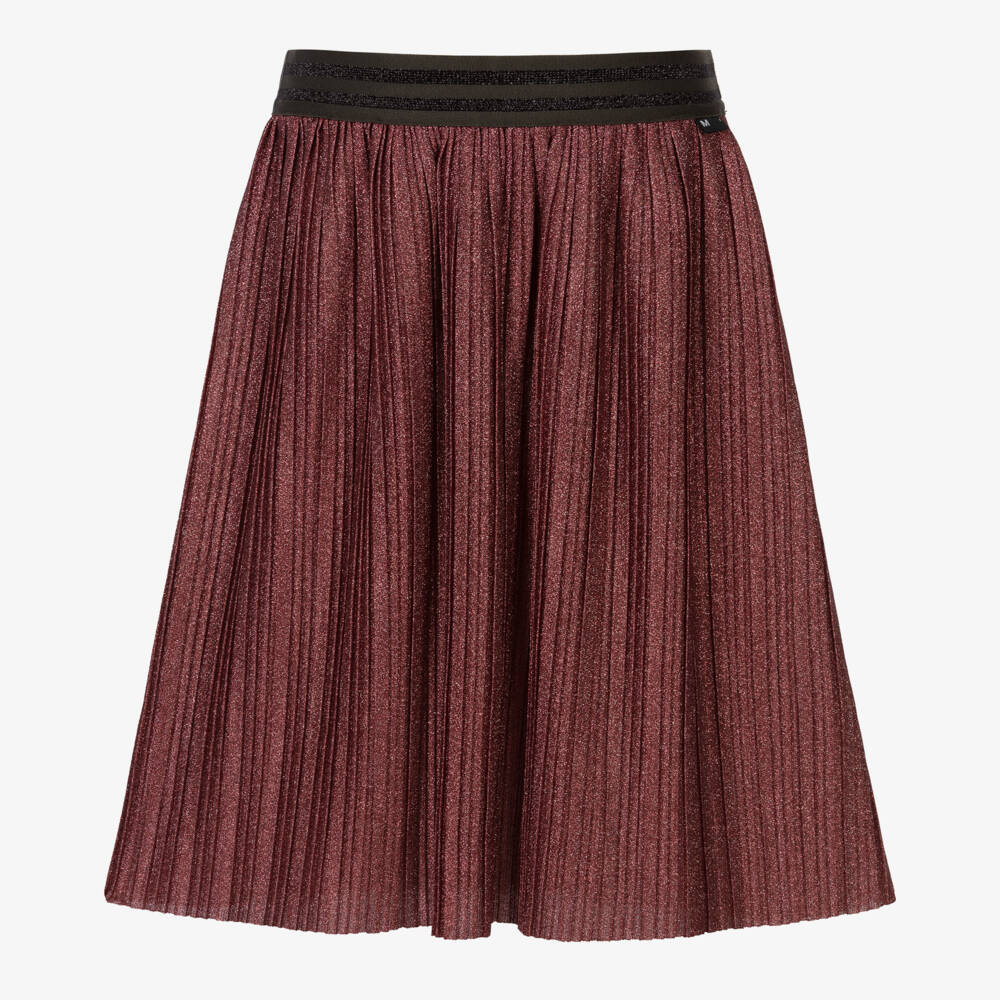 Girls dark red midi length skirt by Molo made with glittery pleated lurex. It has a wide, dark khaki green elasticated waistband with two metallic black stripes.
