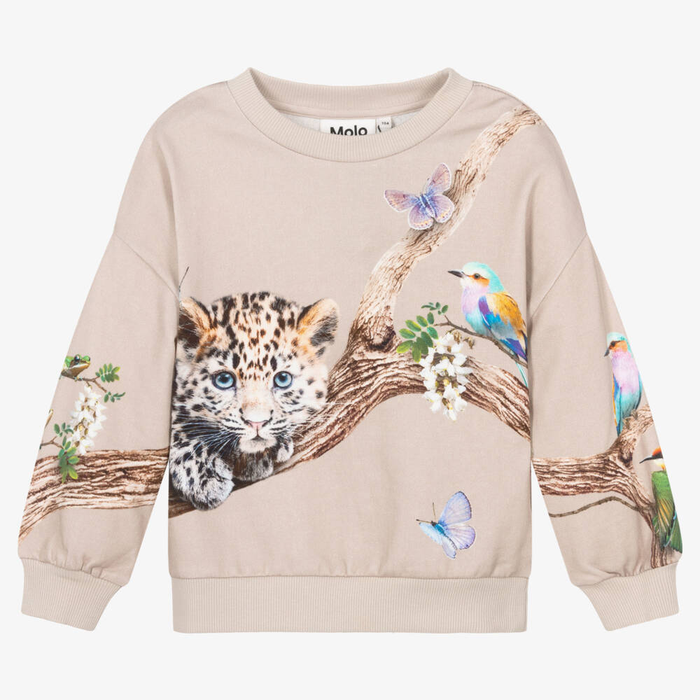 Beige crew neck sweatshirt for girls, by Danish brand Molo. Made in soft organic cotton jersey, it has a cute jungle print on the front for a nature-inspired look and stretchy ribbed trims.