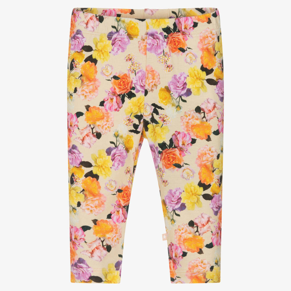 Lovely beige leggings for younger girls by Molo, patterned with colourful roses. Super soft and stretchy, they are made from organic cotton jersey with a comfortable, elasticated waist. The brand's small star logo tab is attached to one leg.