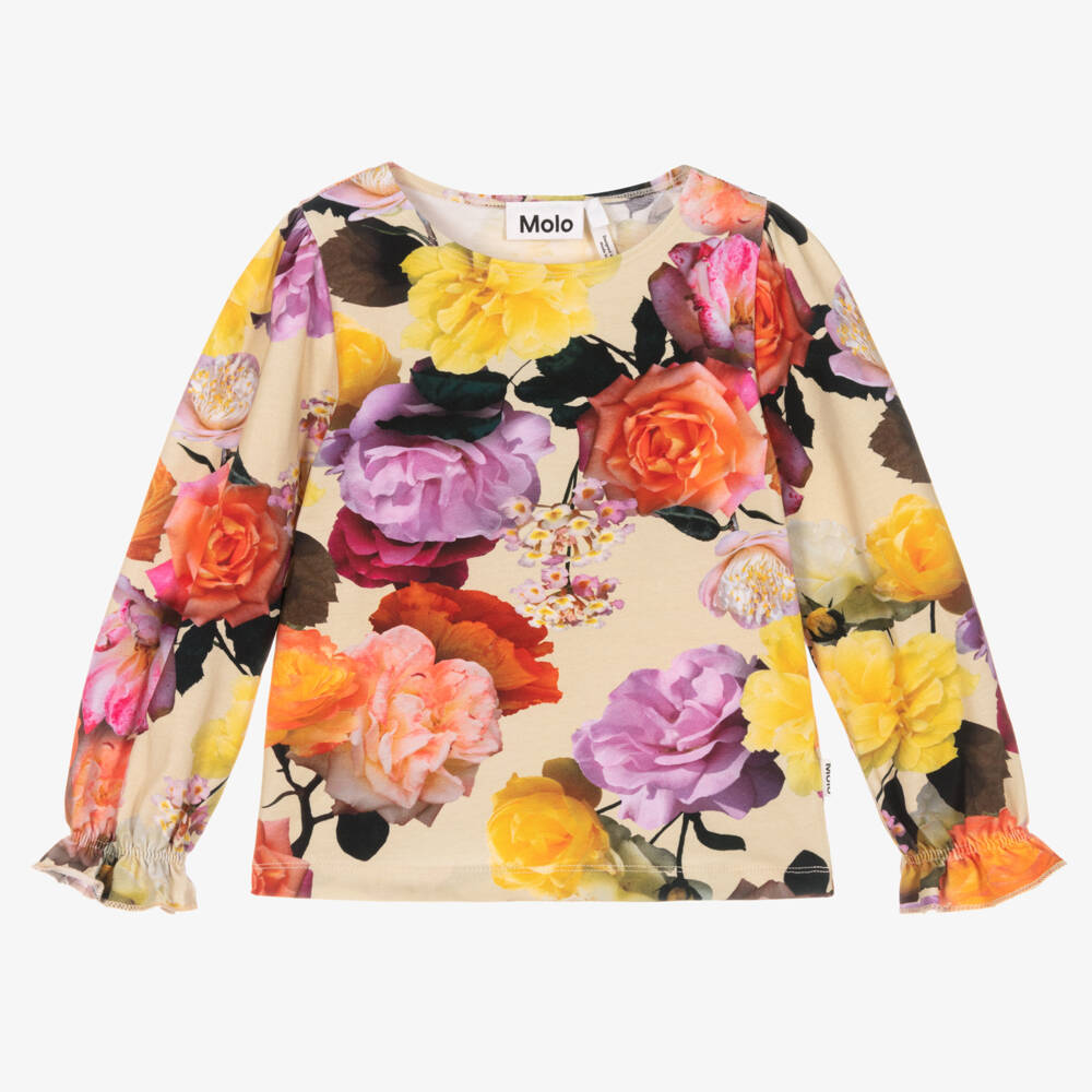 A casual long-sleeved beige T-shirt for girls by Molo, made in the softest organic cotton jersey. Pretty and playful, this comfortable tee is patterned in a vivid floral design, with elasticated frilly cuffs for an added feminine touch.