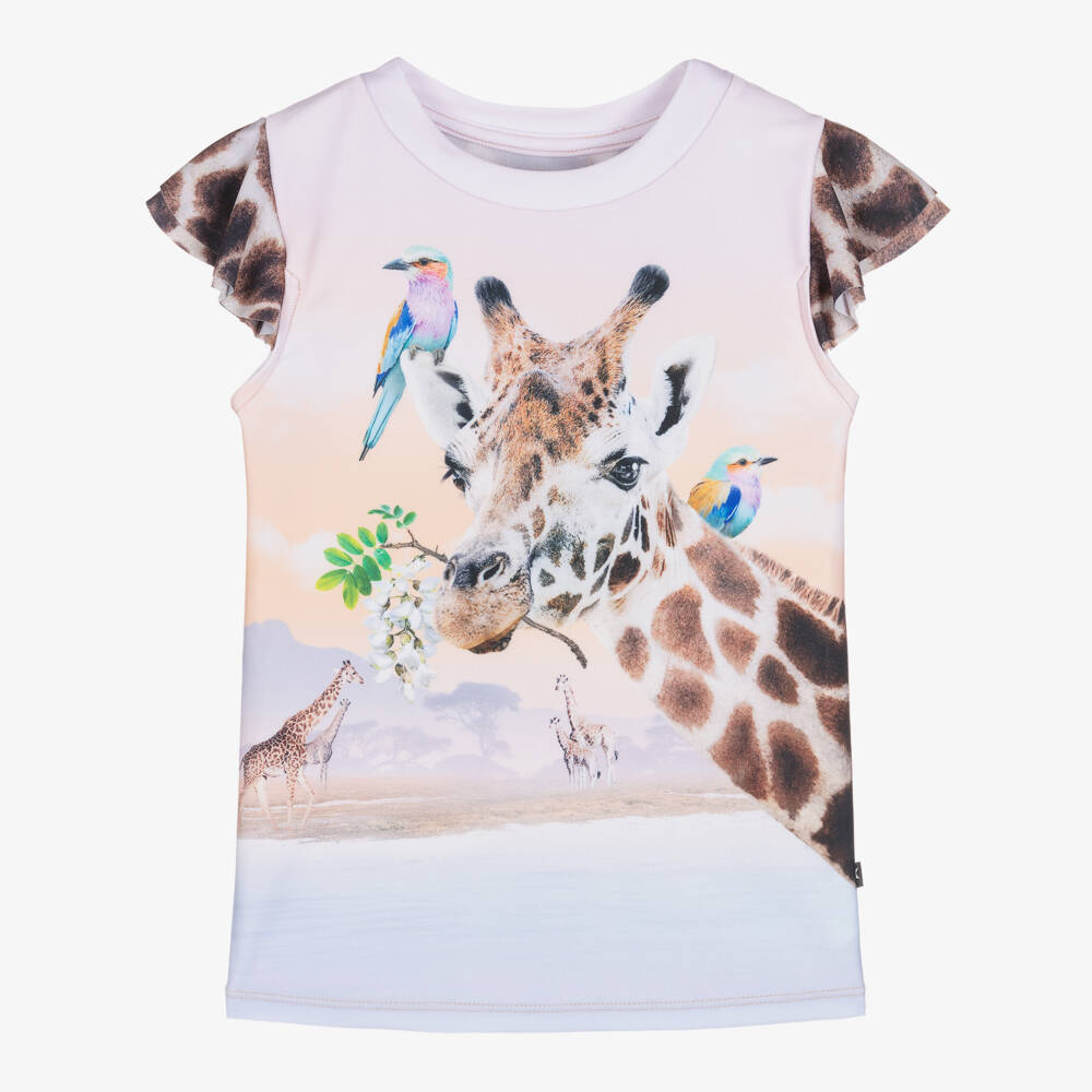 Beige and brown giraffe print sun top for girls from Danish brand Molo, with birds and flowers. Silky smooth and stretchy, it is ideal for use at the beach or around the pool with UPF 50+. This sleeveless top has frill details on the shoulders for a feminine shape.