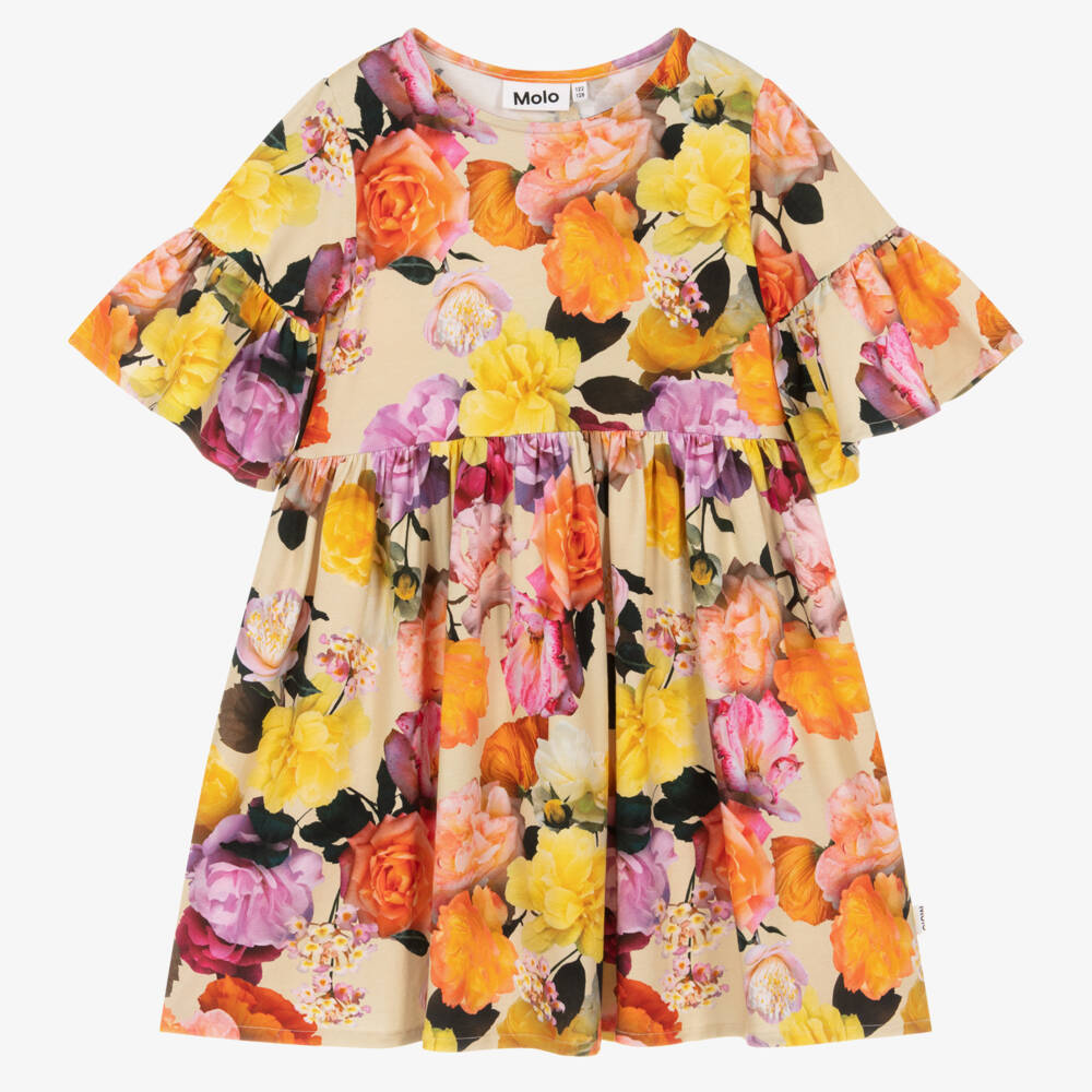 Lovely beige organic cotton dress for girls by Danish brand Molo, with a vibrant pink, orange and yellow rose print. Made in comfortable jersey, it has gorgeous frill sleeves and a gathered skirt. Easy to wear, it simply pulls on.