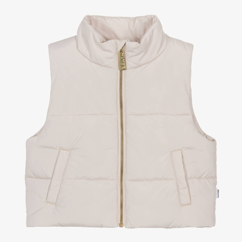 Beige padded puffer gilet for girls by Danish brand Molo, with a stylish colourful orchid print on the back. Made in silky soft, recycled fabric, with a fluorine-free, water repellent finish, it is padded with mid-weight technical down, so is both lightweight and warm. It has a high stand-up collar to keep little necks warm, popper-fastening pockets and an internal drawstring around the hemline for extra protection against the weather. Lined in soft satin for comfort, it has a zip fastening with a useful chin guard on the front.