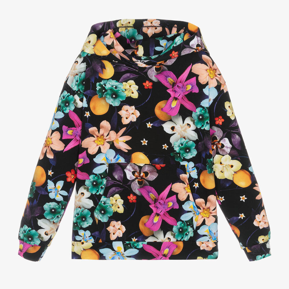 Black floral hoodie for girls from Molo, with a super-vibrant orchid and citrus pattern. The soft organic cotton fabric makes this hoodie a great choice as a lightweight layer. In a relaxed silhouette, it is designed with dropped shoulders and a pouch pocket on the front.