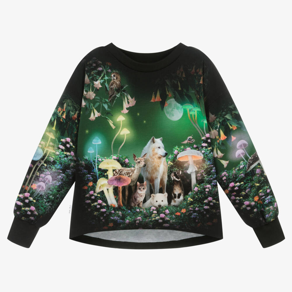 A long-sleeved top for girls by Danish label Molo, in black. Soft, stretchy and comfortable, it is made in organic cotton and patterned with a magical woodland print amongst animals and glowing mushrooms. A logo tab on the side seam and softly ribbed cuffs complete the look.