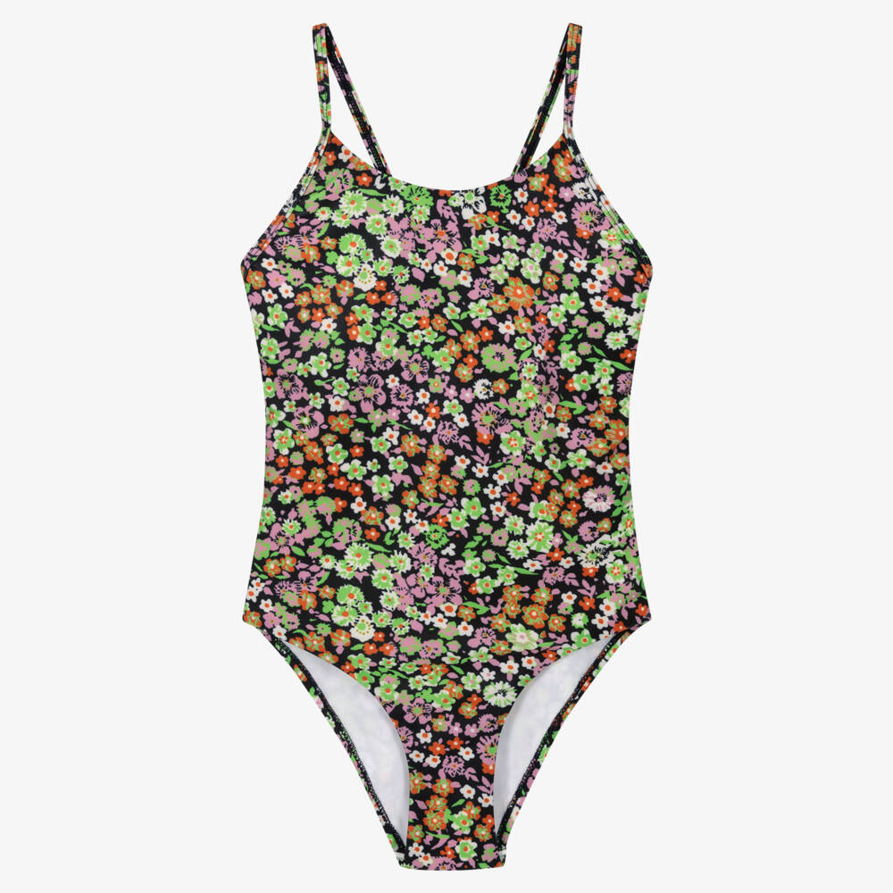 Black swimsuit for girls by Molo, in an all-over green, pink and ivory floral print. Made from Repreve® recycled polyester and fully lined, it has a UPF 50+ sun protection factor. It is designed with a low back and cross-over shoulder straps.