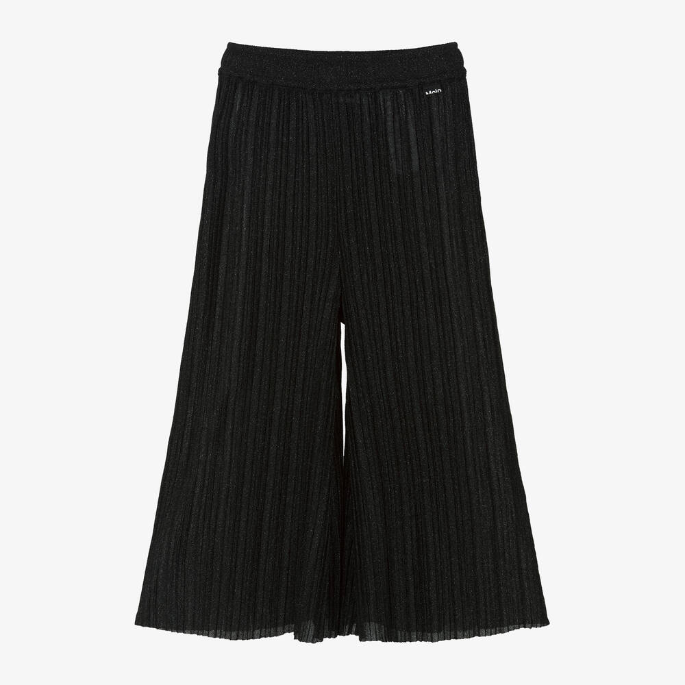 Stylish black wide-leg trousers for girls by Molo, with a gorgeous shimmer. Made in semi-sheer pleated crêpe, these lightweight trousers have the brand's logo tab stitched on the front for a subtle designer touch. They have a gently elasticated waistband to ensure a comfortable fit.