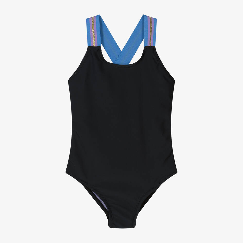 Stylish black swimsuit for girls by Danish brand Molo, with UPF50+. Silky smooth and stretchy, it has a contrasting lilac purple lining and elasticated, cross-over shoulder straps with blue, purple and metallic gold stripes.