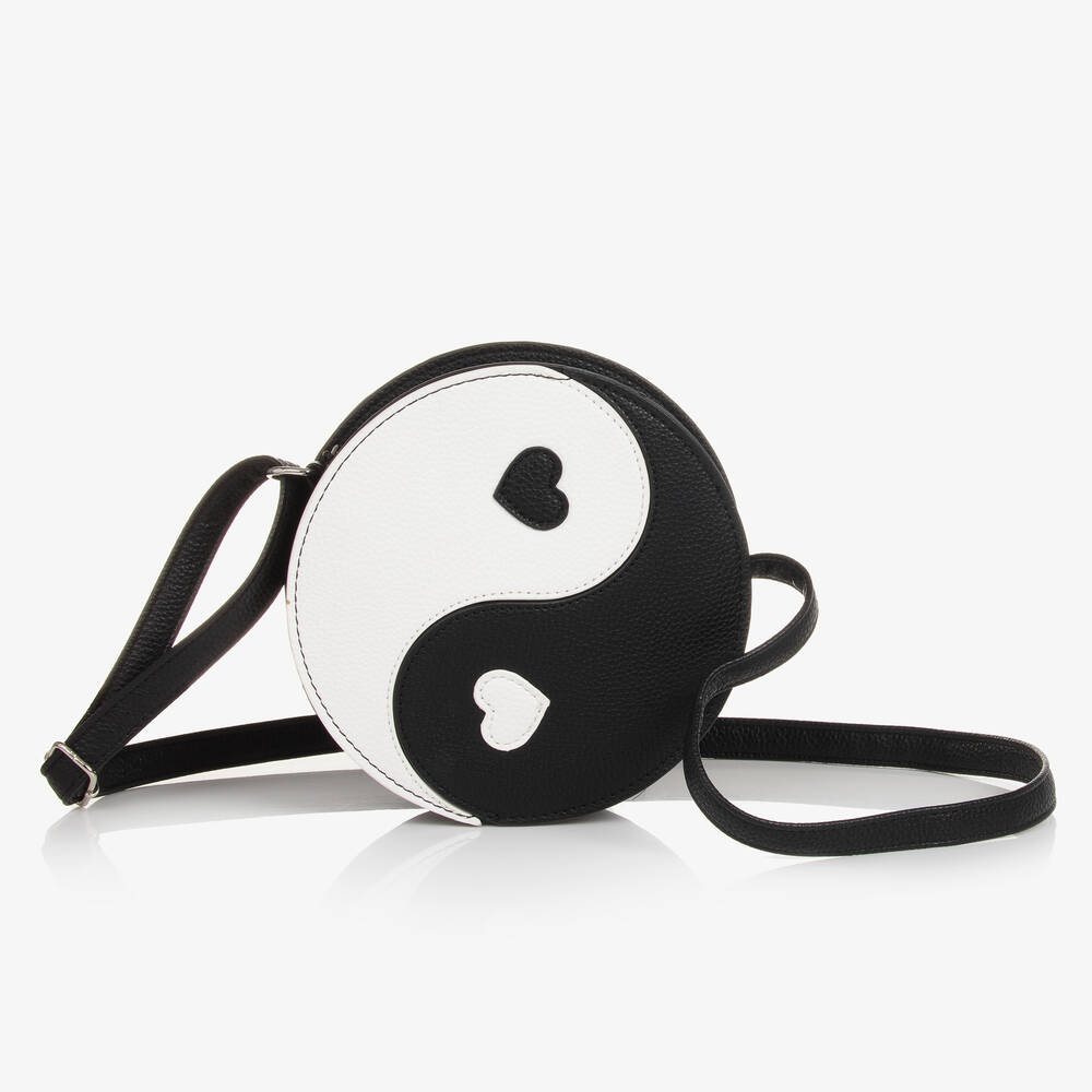 A black and white, yin and yang shoulder bag for girls by Molo. This fun circular design is made in faux leather with a flat grain appearance. Lined in silky fabric, the bag has a zip fastening main compartment, with an inner zipped pocket. The fixed strap is adjustable and can be used as a carry handle or as shoulder strap.