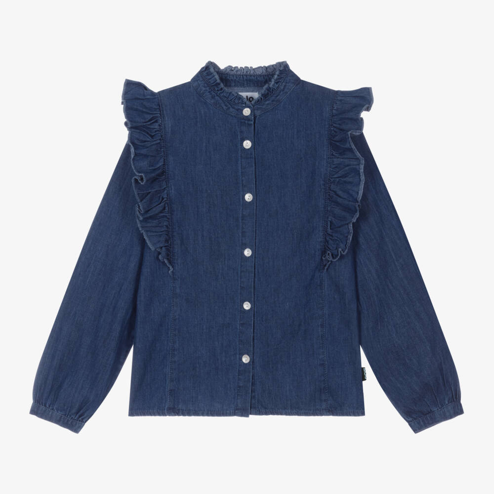 Blue chambray blouse for girls by Danish brand Molo, with pretty ruffles around the neckline and over the shoulders. Made in lightweight, organic cotton, it has white mother-of-pearl button fastenings on both the front and cuffs of the long sleeves.