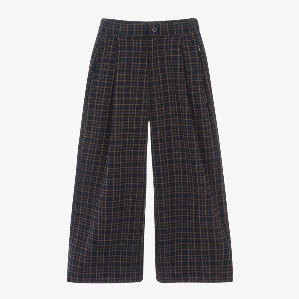 Navy blue and brown check trousers for girls by Danish brand Molo, ideal for smart occasions, or for elevating a casual look. Made in a soft, lightweight twill, they have a wide-leg style, with pleats on the front for extra fullness and useful, slanted pockets. The waistband is elasticated around the back for comfort and fastens with a button and a zip below.