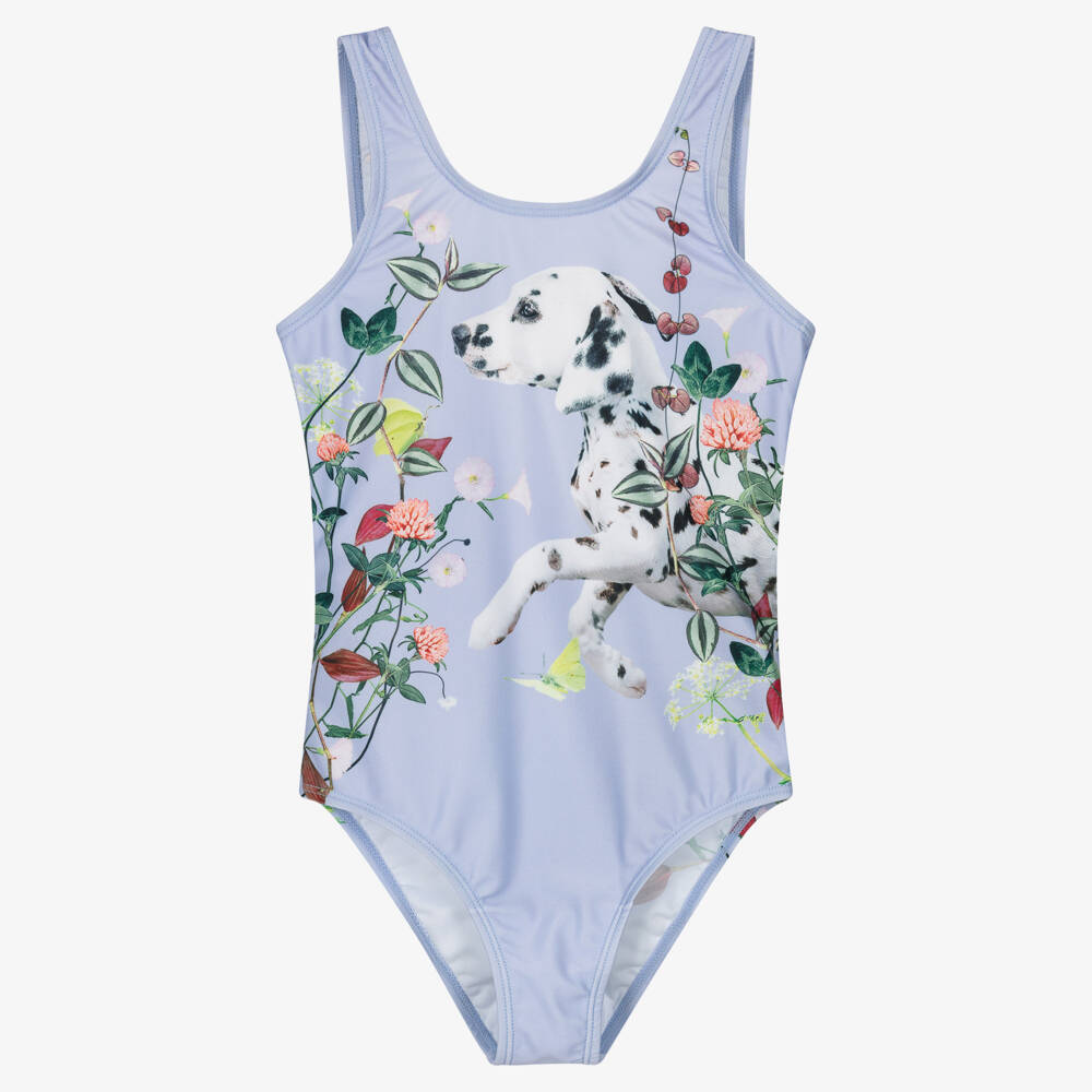 Lavender blue swimsuit for girls by Molo, with a UPF 50+ sun protection factor. In a classic styling, it has colourful floral and an adorable white and black dalmatian dog prints. It is made from Repreve® recycled polyester and fully lined for comfort.