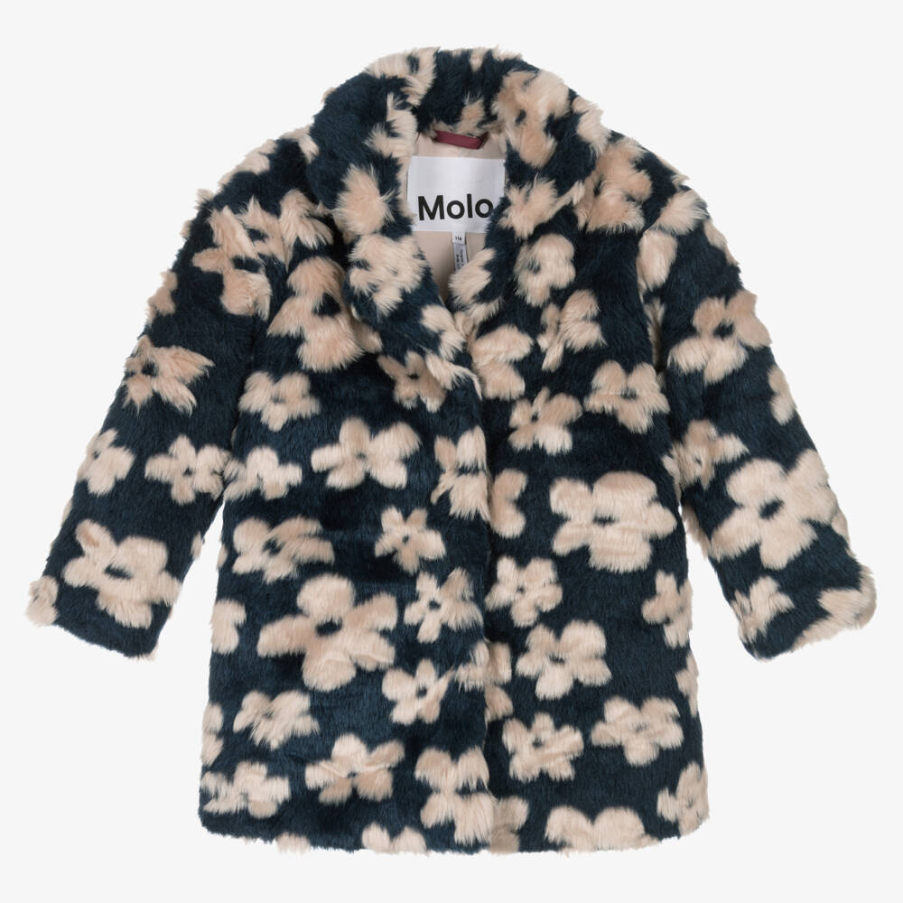 A navy blue faux fur coat for girls by Molo, in a fun pale pink floral pattern. It has a revere collar and concealed pockets for a chic yet stylish look. Fastening with poppers, a silky smooth lining comfortably finishes the design.