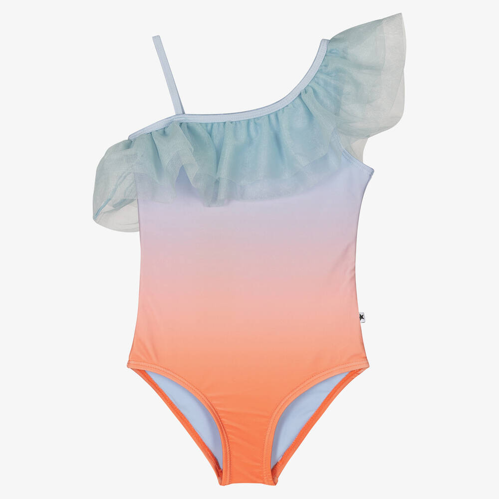 Pretty pale blue and orange swimsuit for girls, by Danish brand Molo. Silky and stretchy, the fabric has UPF 50+ and it is fully lined for comfort. The cut is asymmetric with a thin adjustable strap and a thick fixed strap which is trimmed with tulle ruffle for a fun finish.