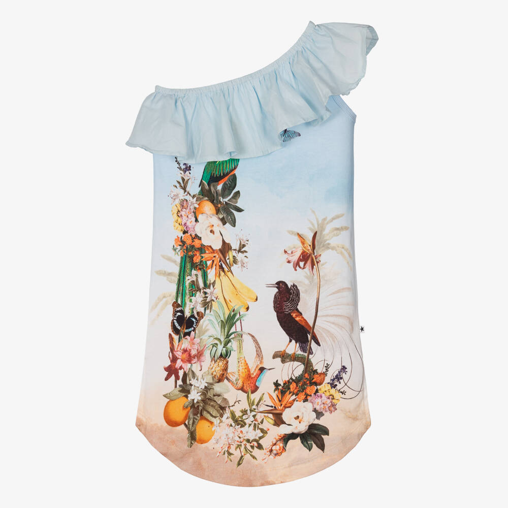 Pretty blue beach dress for girls by Danish brand Molo, with a graphic tropical bird print. Made in organic cotton jersey, it has a lovely voile ruffle along the neckline and over one shoulder. The curved hem has side vents for added comfort.