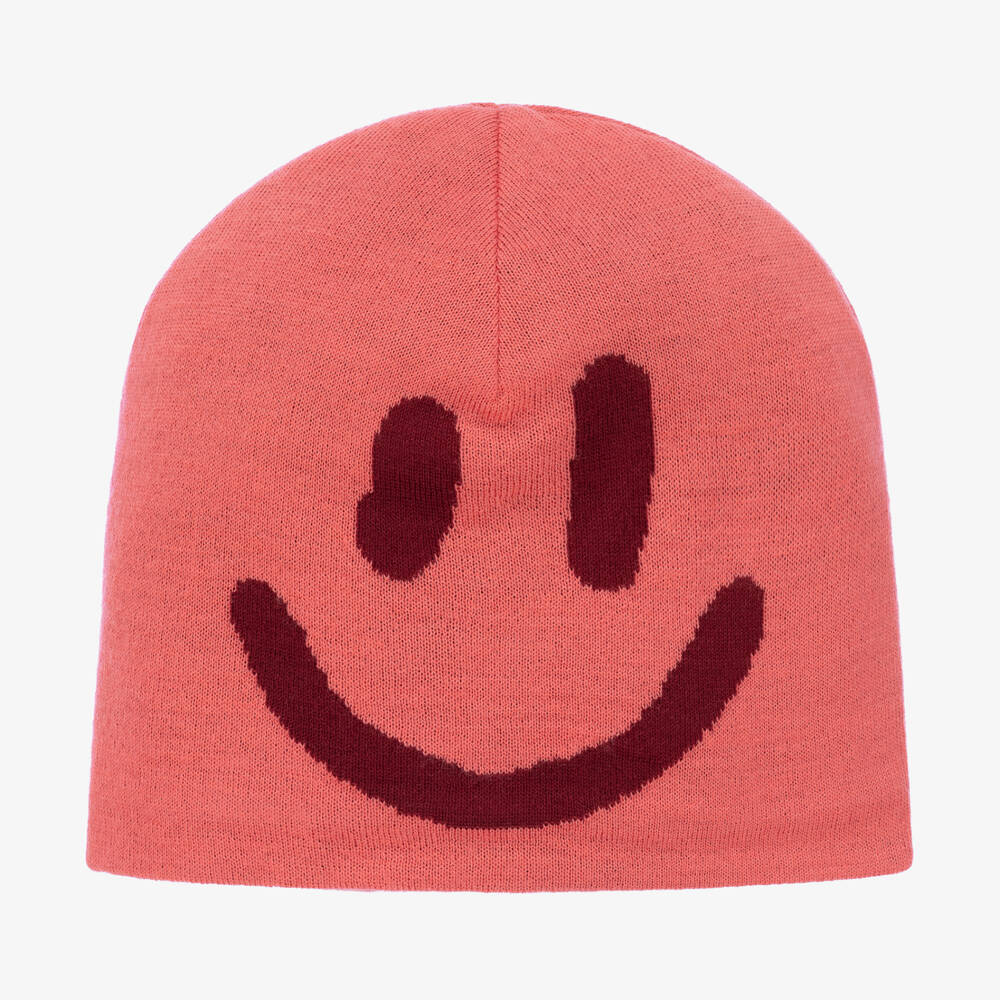 Girls coral pink wool hat by Danish brand Molo, knitted from a super soft wool acrylic blend. Lined with warm grey fleece, it has a cute smiley face on the front.