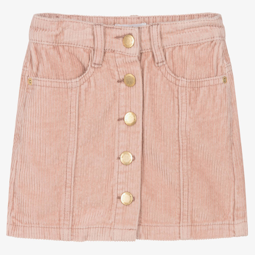 Dusky pink skirt for girls by Danish brand Molo, made from soft cotton corduroy with added stretch. Great for pairing with tops and blouses, this casual skirt is designed with front pockets, belt loops and logo-embossed rivets. It fastens with branded poppers at the top and has an adjustable waistband to ensure a good fit. The logo badge on the back of the waist adds a final designer touch.