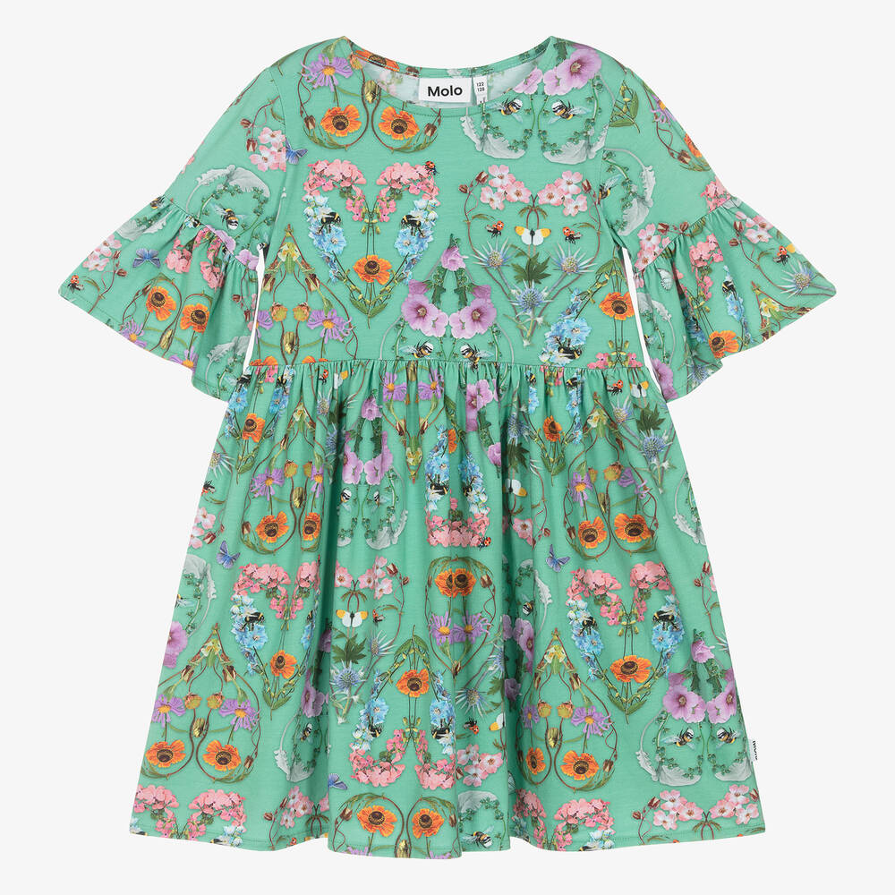 A pretty green dress for girls by Danish brand Molo, made from soft organic cotton jersey. Easy to slip on, this casual style is printed with colourful florals, garden insects and green leaves. Together, these form heart-shaped motifs within the design. It has a gathered waistline and feminine sleeves with a flounce along the bottom edge.