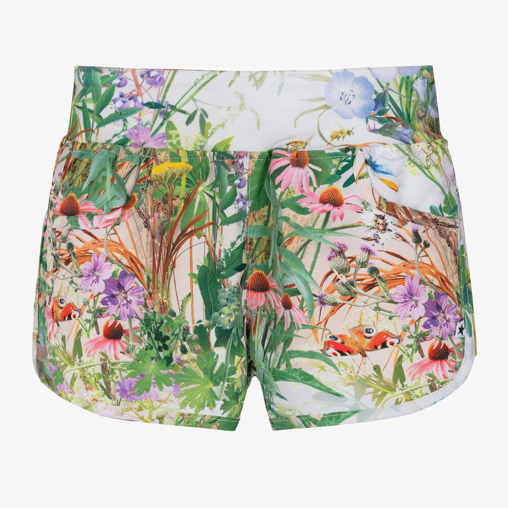 Pretty green swim shorts for girls by Molo, with a colourful wildflower pattern. Offering comfort in the water, they are quick-drying and have a stretchy elasticated waistband. Made in a smooth recycled UPF50+ fabric, they have useful pockets on the front.