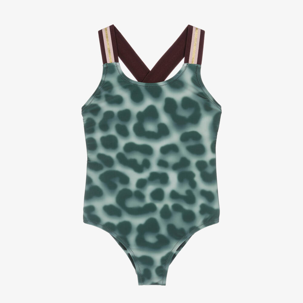 Timelessly stylish green jaguar print swimsuit for girls from Danish brand Molo. Silky smooth and fully lined for added comfort, it has pretty burgundy red, pink and metallic gold striped cross-over straps and a low scoop back.