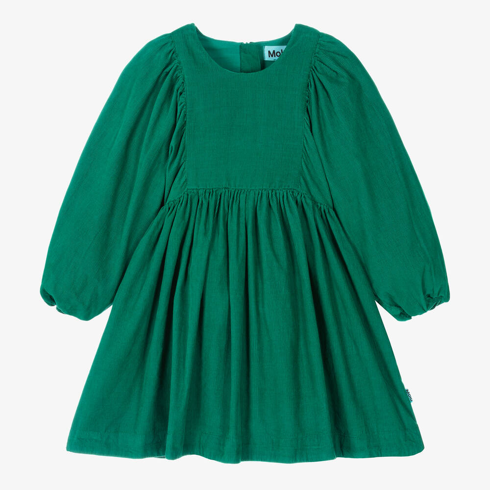 Stylish bright green organic cotton dress for girls by Molo, with oversized puffed long sleeves. Made in fine needlecord for a beautifully soft feel, this lovely dress is designed with a full skirt, a relaxed fit bodice and elasticated cuffs. A concealed zip fastens on the back for a neat finish.