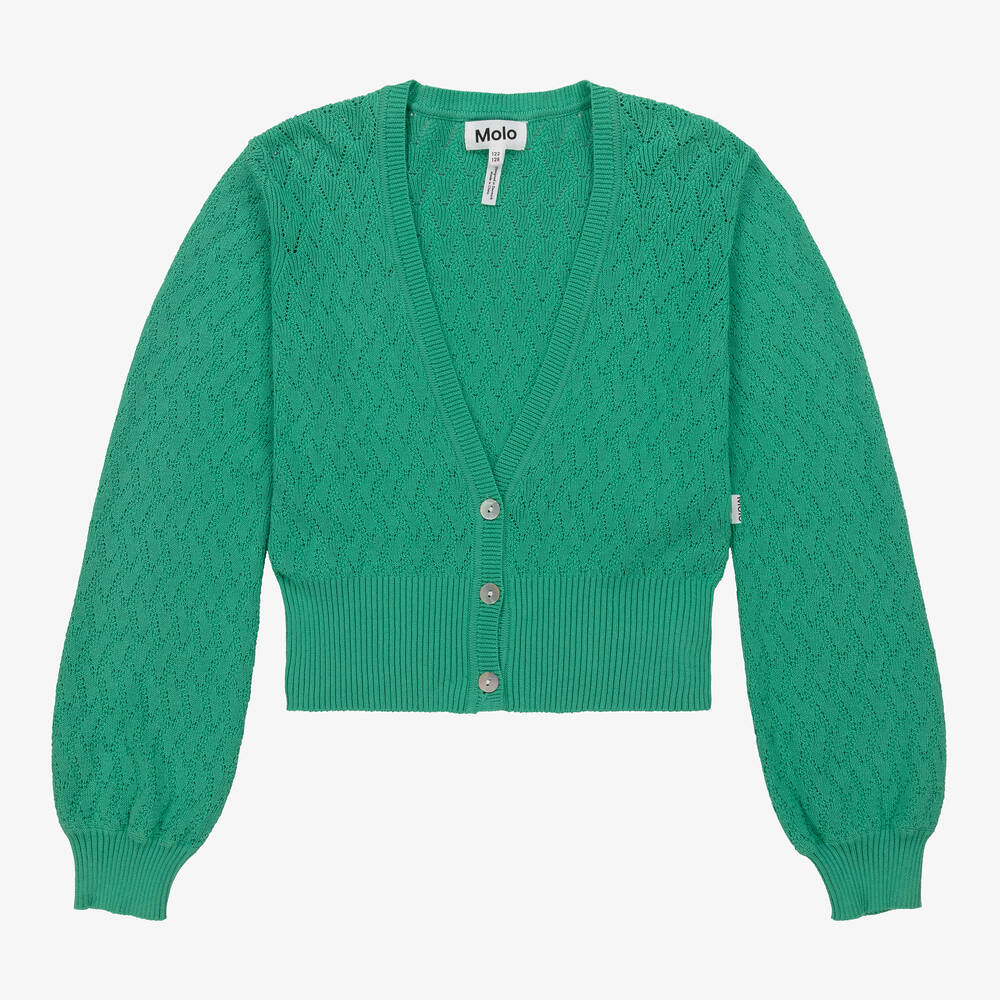 A lovely cardigan for girls by Molo, in a muted shade of pastel green. With an intricate openwork pattern, it is knitted in super-soft, lightweight organic cotton. This V-neck cardigan has deep, ribbed cuffs, long sleeves and mother-of-pearl button fastenings on the front.