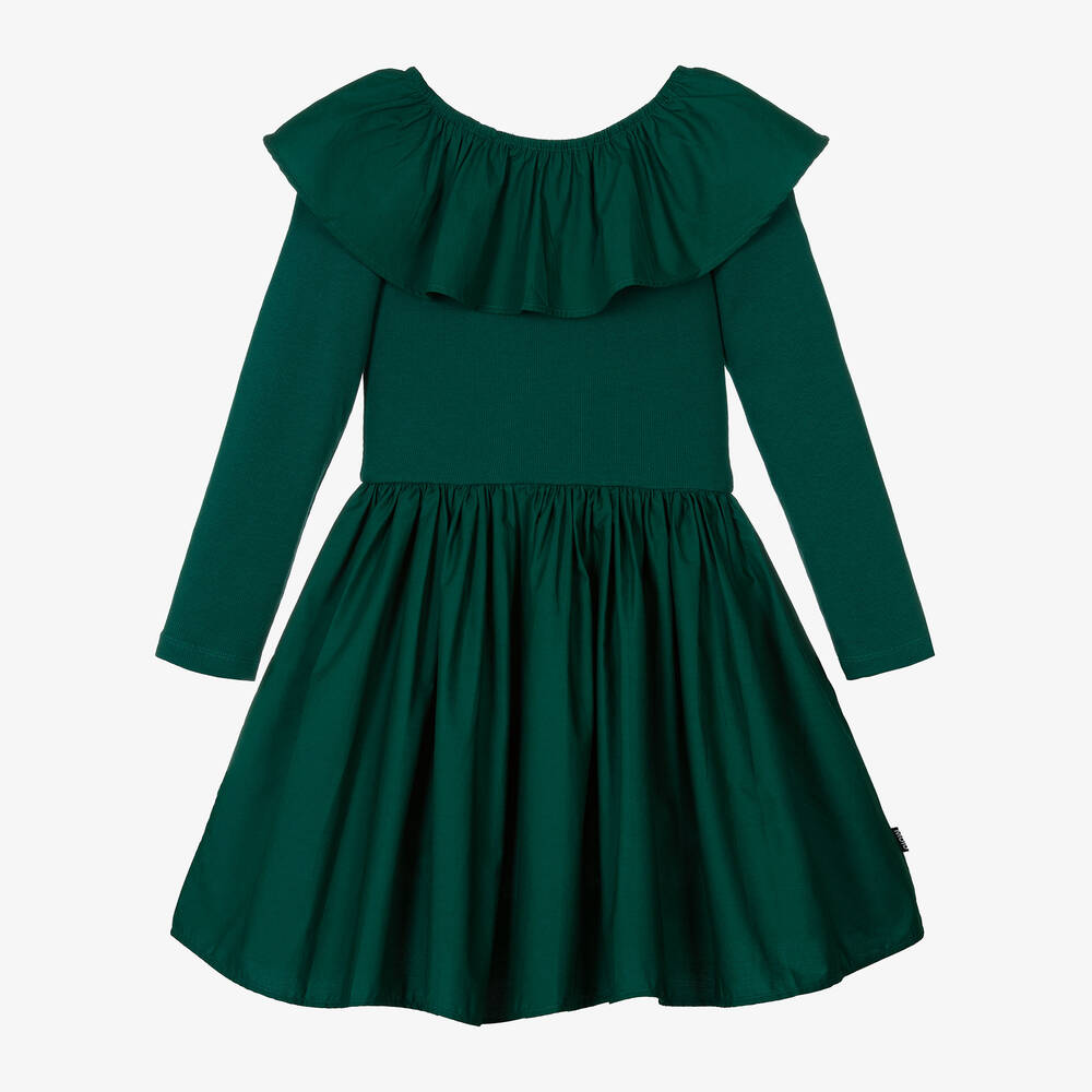 A lovely dark green fit and flare organic cotton dress for girls from Danish brand Molo. The bodice and long sleeves are made in soft and finely ribbed jersey for comfort. The gathered poplin skirt and gently elasticated ruffle neckline give it a pretty silhouette. It can also be styled off-the-shoulder for a different look.
