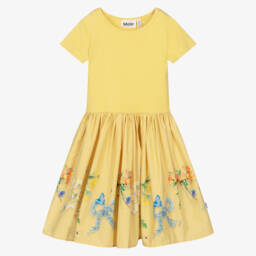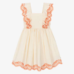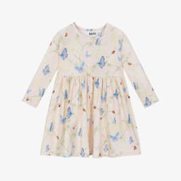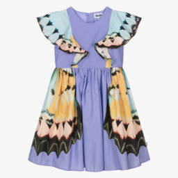 In green and red, this fun watermelon print dress for little girls is by Molo. Woven in soft organic cotton, it has a pretty gathered skirt, with useful poppers on each shoulder to assist with dressing.