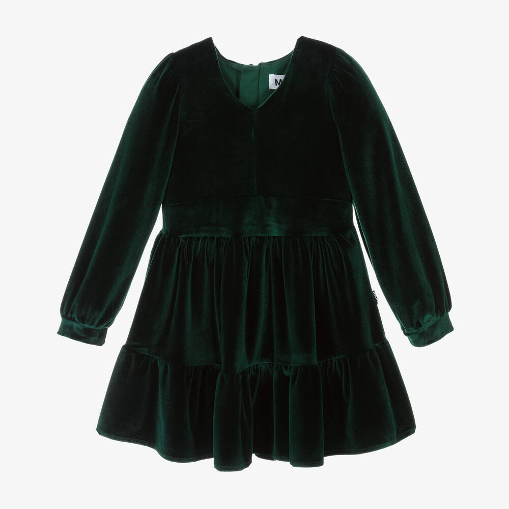 Smart green velour dress for girls by Danish brand Molo, with a lovely sheen. Soft and stretchy, this comfortable style has pretty, puffed sleeves, a deep frill around the hemline and a neat, concealed side zip fastening on the back.