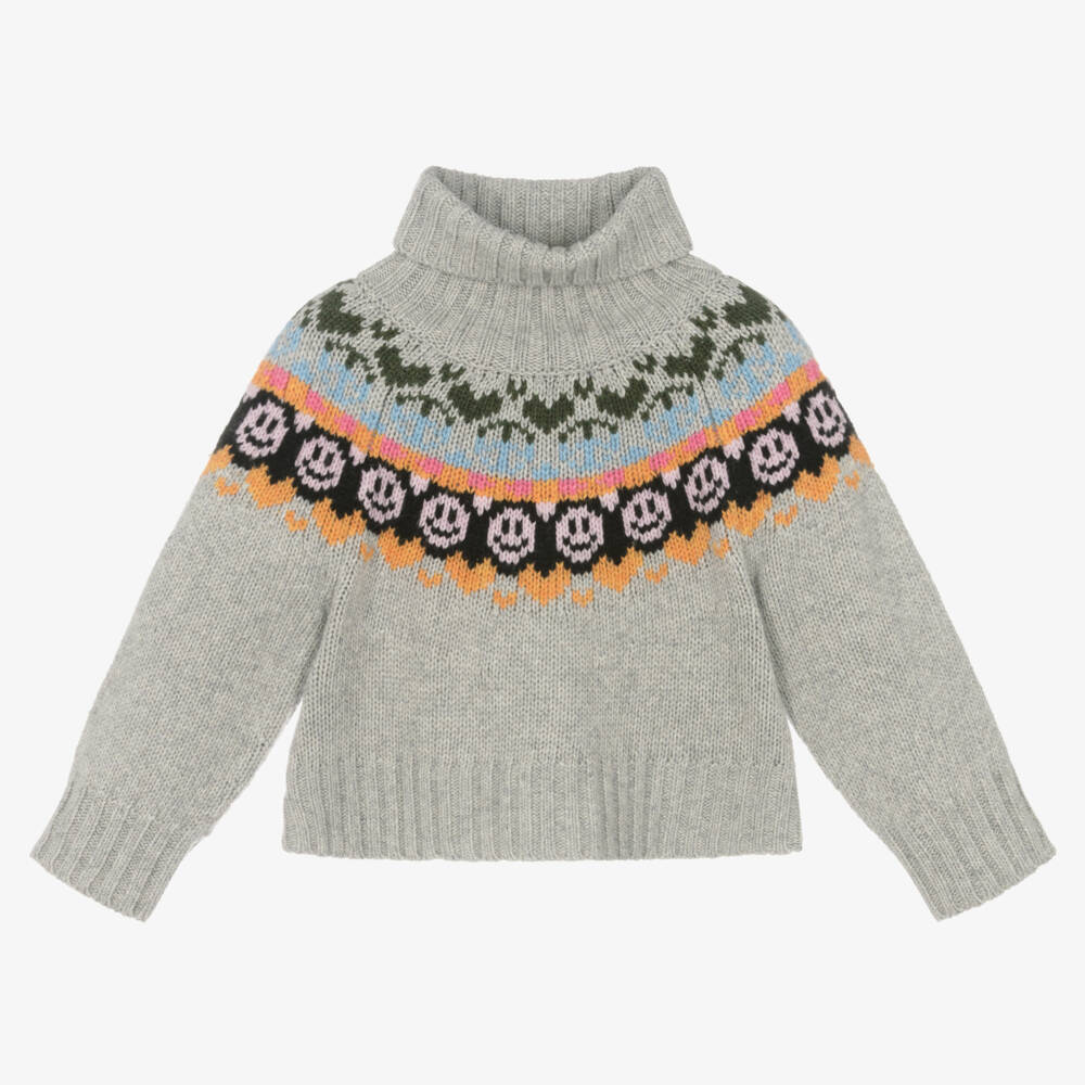Grey knitted roll neck sweater for girls by Molo, with a colourful blue and orange Fair Isle design around the shoulders, including fun, pink, happy faces and green hearts. With a boxy fit, it is softly knitted in a warm, chunky wool blend with raglan sleeves and cosy ribbed trims. It has a logo tab on one side seam for a subtle branded finish.