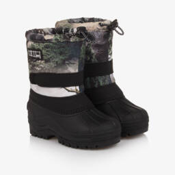 Ivory leopard print snow boots for girls by Molo, providing protection against the snow and wet. They are water repellent with a warm fleece lining and a light-reflective strip on the back of the heels. The lower half is made in durable thermoplastic rubber with a deep tread on the outer soles for a sure grip. There is a velcro fastening strap across the front, a toggle adjuster at the top, and a rubberised black and white logo patch on one side.