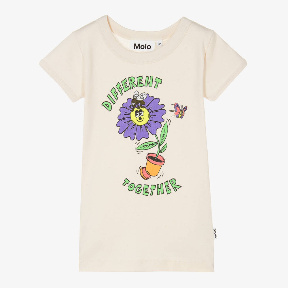 Girls ivory organic cotton T-shirt by Molo, made of soft and stretchy jersey. This fun top has a bright purple floral motif printed on the front, with short sleeves and a crew neckline. There is a small branded tab on one side for an added designer touch.