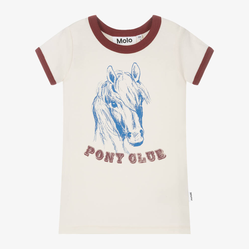 An ivory T-shirt for girls by Molo, made from soft organic cotton jersey. It is patterned with a blue horse on the front and has a 'Pony Club' slogan printed below for a playful look. This casual top is finished with burgundy red trims on the crew neck and short sleeves.