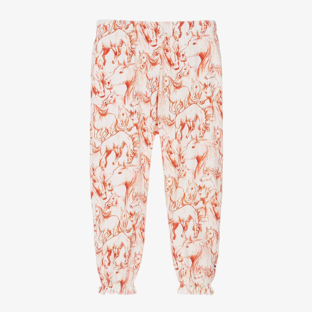 Super fun and creative, these ivory casual trousers for girls are by Molo. Great for a quirky and individual look, they are printed with a lovely red horses pattern in a cool sketchpad illustration style. Made from soft organic cotton jersey, they have stretchy frilled cuffs and an elasticated waistband for a comfortable fit.