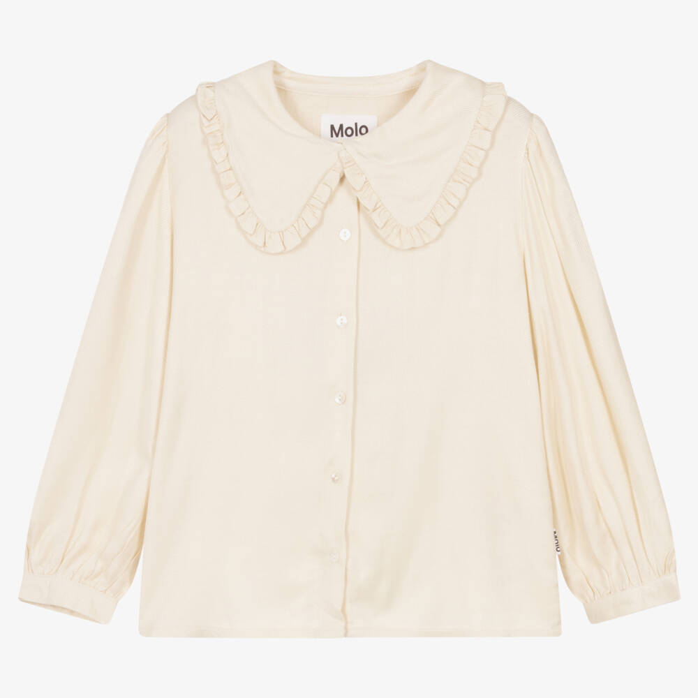 An ivory blouse for girls by Danish brand Molo, in silky soft twill with a pretty sheen. A lovely option for layering, it has a ruffle-trimmed collar and delicate puff sleeves. Pearlescent button fastenings finish the look.