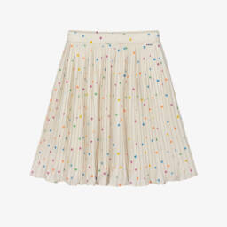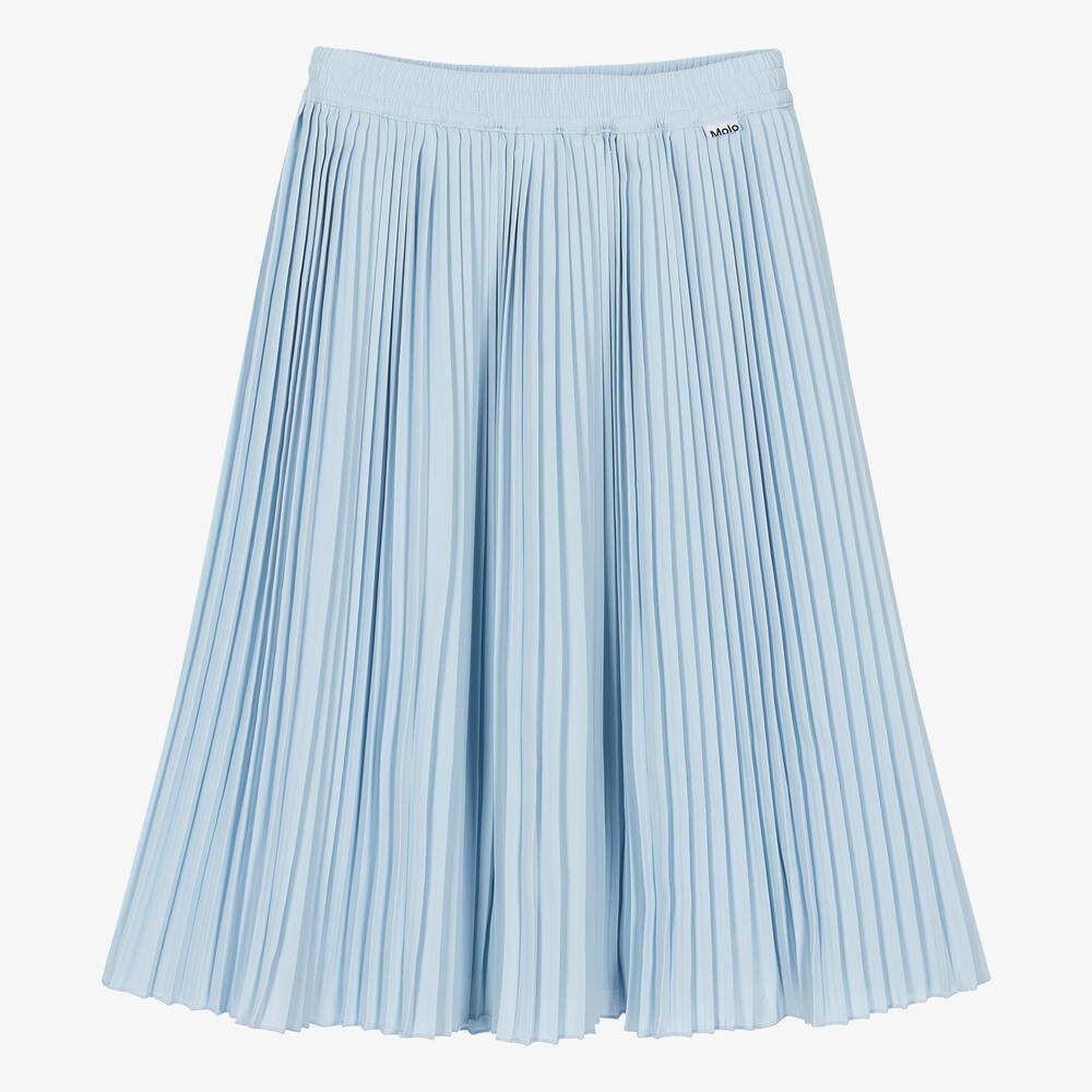 Light blue skirt for girls by Danish brand Molo, made in mid-weight twill. This pleated skirt has an elasticated waistband for a comfortable fit, with a flowy skirt falling below the knee. The brand's black and white logo tab is stitched on the front for a subtle designer touch.