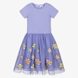 Lilac purple dress for girls by Molo, made with a jersey bodice and lightweight tulle skirt. The full skirt is embellished with pretty sequin smiling flowers for a playful finish. Lined in soft cotton for comfort, it simply pulls on over the head.