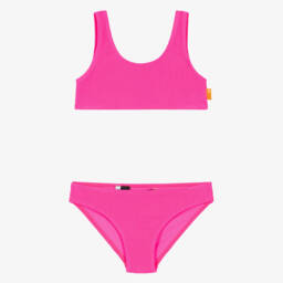 Neon pink bikini for girls by Molo, made in a soft and stretchy crinkle-textured fabric, with UPF50+. A stylish choice for the beach or pool, this comfortable two-piece features a scooped neckline and a soft lining.