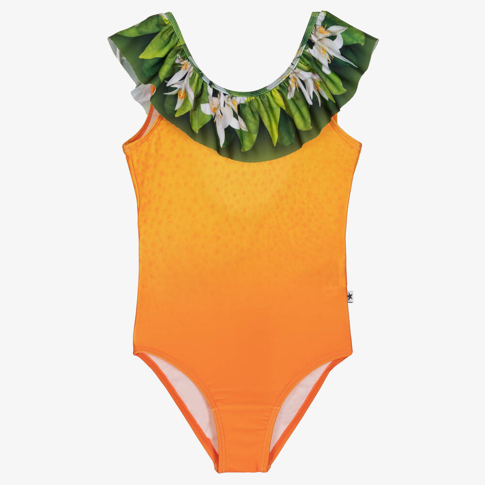 Bright orange swimsuit for girls by Molo, with UPF 50+. Classically styled, it has an eye-catching green floral printed ruffle on the neckline and a cute blue butterfly on the back. Silky smooth and stretchy, it is fully lined for added comfort and modesty.