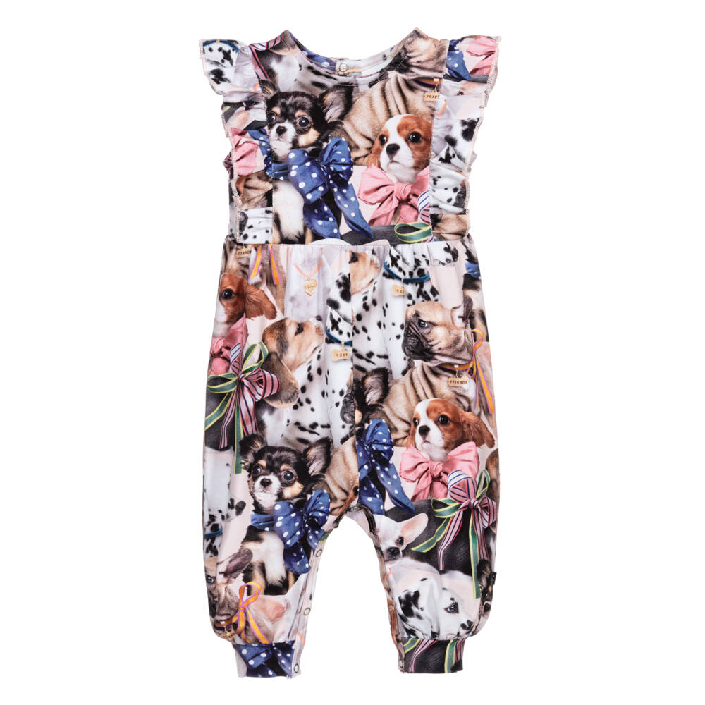 Organic cotton jumpsuit for little girls by Molo, made in stretchy jersey. It has a cute dog print in black, brown and blue on a pink background. There are popper fastenings on the back and between the legs.