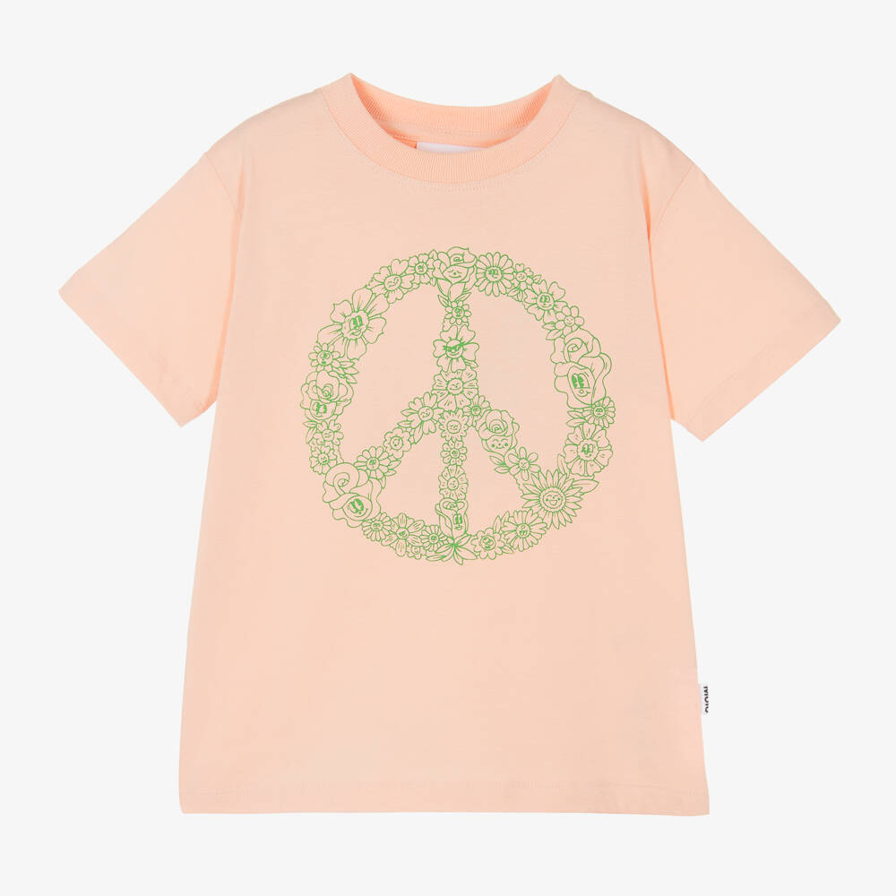 Pale pink short-sleeved girls T-shirt by Molo. Made from a soft organic cotton, it has a printed green floral peace sign on the front with a ribbed crew neck. There is a small branded tab on the side seam for an added designer touch.
