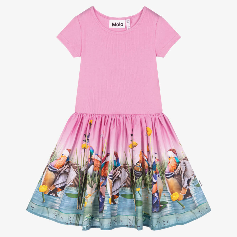 Girls lilac pink dress by Molo, made in organic cotton. Cool and casual, this dress has a soft ribbed jersey bodice with capped sleeves and a smooth poplin skirt, patterned with a quirky duck and buttercup flower graphic print in hues of green, blue and orange for a pretty finish.