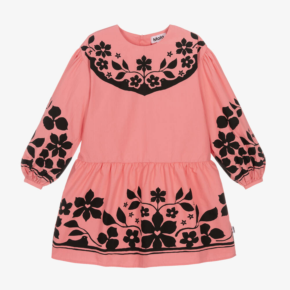 Striking pink organic cotton dress for girls by Danish brand Molo, with a stylised black floral print. Made in comfortable, lightweight poplin, it has full, gathered sleeves and a gathered skirt below the dropped waist. The dress fastens with a neat, concealed zip on the back and mother-of-pearl buttons on the cuffs.