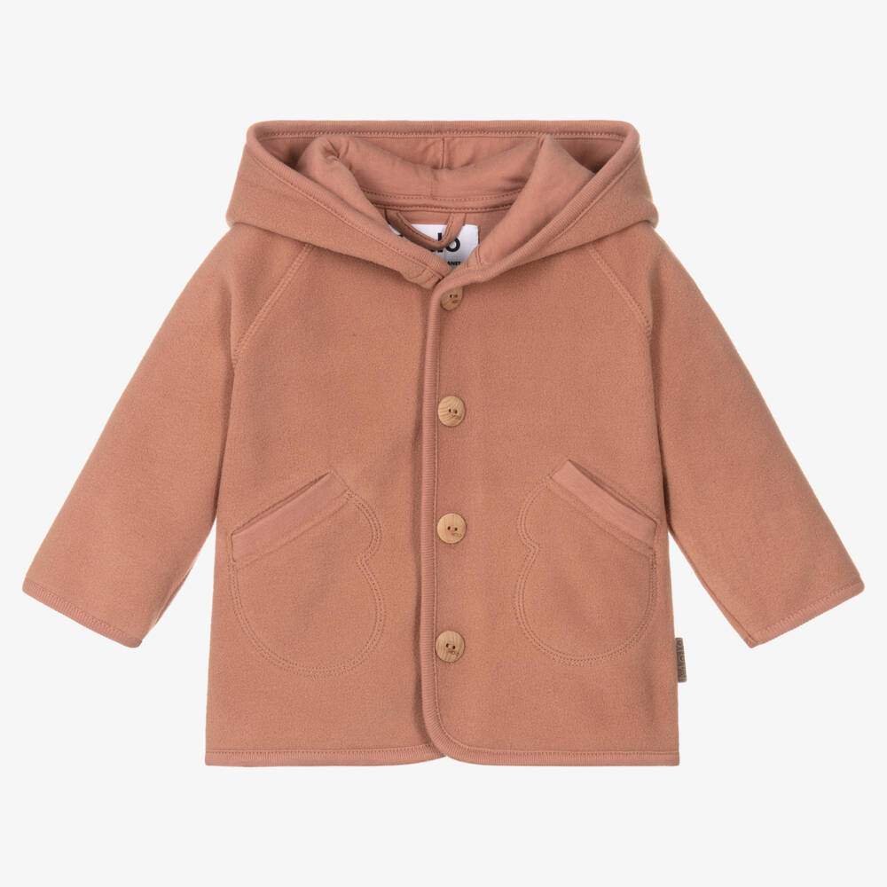 Dusky rose pink hooded jacket for little girls by Danish label Molo, made in super-soft polar fleece. Eco-conscious, it is made with recycled polyester from plastic bottles. This sweet jacket has piped trims, wooden button fastenings and cute mitten-shaped front pockets.