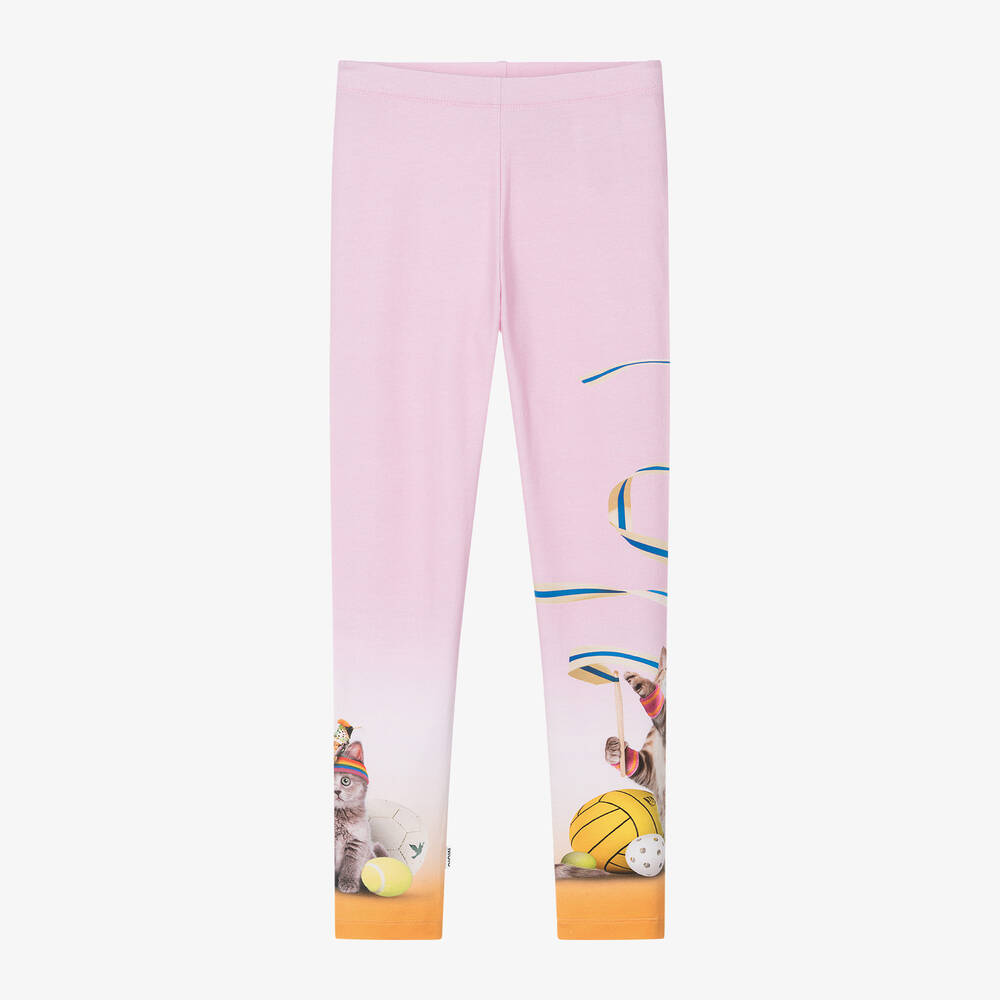 Organic cotton leggings for girls from Molo, in a pink and orange gradient. With a comfortable, elasticated waist, these full-length leggings feature an adorable print of playful kittens and sports balls.